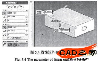 選取閥體的頂面,在此基準(zhǔn)面上繪制一直徑為14mm的圓。同樣,還要標(biāo)注圓心的位置,然后選擇特征工具欄的切除拉伸工具,切除深度設(shè)置為11mm。按照上述方法在新切出的圓面上以此圓為圓心繪制一個(gè)直徑9mm的圓,然后切除深度設(shè)為完全貫穿。點(diǎn)選線(xiàn)性陣列工具,參數(shù)設(shè)定如圖5.4所示,在要陣列的特征中選取剛才做的那兩個(gè)拉伸切除。至此完成了閥體螺紋孔的繪制。