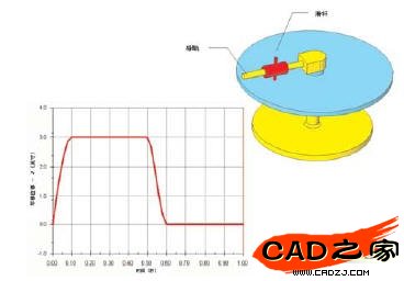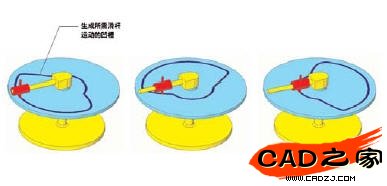 圖10滑桿沿旋轉(zhuǎn)圓盤移動(dòng),繪制出凸輪輪廓,圖中顯示為圓盤上的切槽。