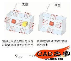 溫度為T1,T2的兩個物體間通過輻射產生的熱交換大小與兩個物體絕對溫度的四次方差,參與輻射的表面積大小和輻射表面的發散率(輻射能力)成正比,輻射表面的發射率可以定義成在同一溫度下表面的發射功率與黑體的發射功率之比。材料指定的發射率值介于0和1.0之間。因此,黑體的發射率為1.0,理想反射體的發射率為0。由于通過輻射產生的熱交換與絕對溫度的四次方成正比,因此對于高溫的熱分析,輻射就顯得非常重要。