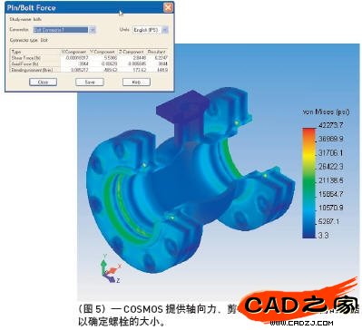 (圖5)—COSMOS提供軸向力、剪切力以及扭矩等必需的數據以確定螺栓的大小。