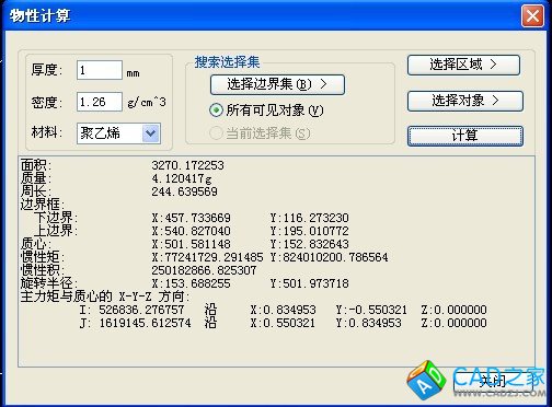 3、堯創機械cad因為有 物性計算 命令,可以選擇這個命令后,點選區域內的點,然后隨便選一個填充物質,水、聚乙烯等都可以,可計算出面積、周長、質心、上下邊界等。