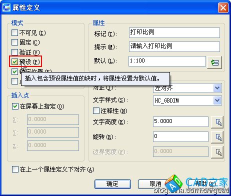 如果在插入屬性框的時候希望直接采用默認值而不顯示命令行提示或彈出編輯對話框,可以在屬性定義對話框中勾選“預設”,如下圖所示。