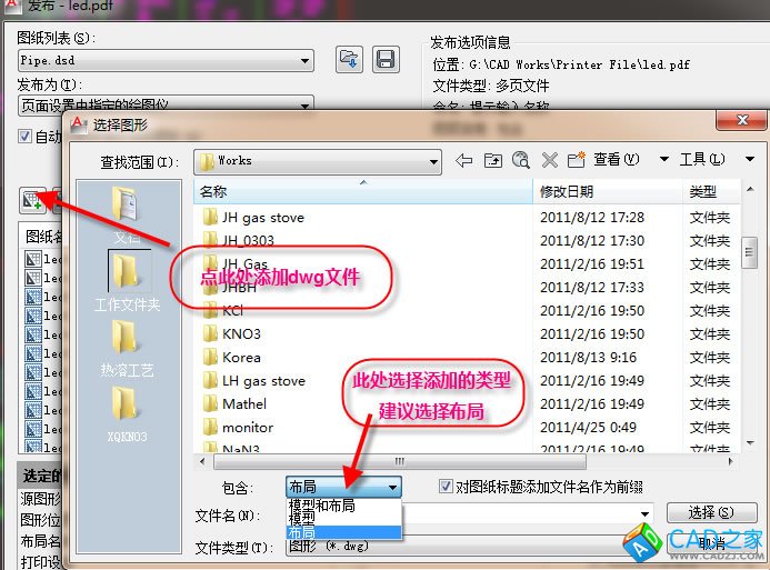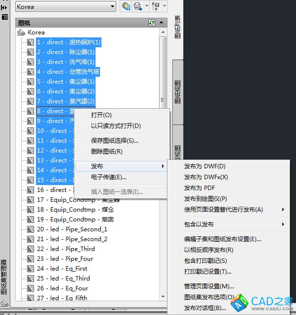1. 比較正規的方法是,建立一個圖紙集。在圖紙集中,可以把一個項目的若干個dwg文件包含進來,而每個dwg文件可以選擇其中的全部或部分布局。在圖紙集中,可以選擇發布到繪圖儀、發布為PDF文件(2010前的版本需系統安裝有PDF打印機)、發布為DWF文件,如圖1。當然也可只選擇圖紙集中的一個或若干個布局來發布(批處理打印),如圖2。用圖紙集的方法不必打開dwg文件即可進行批處理打印。