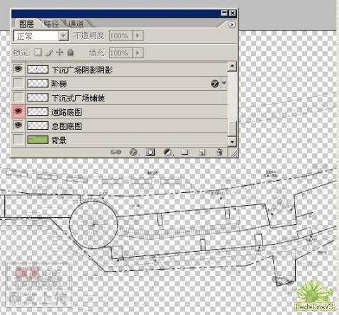 輸出一張家具的CAD圖和一張沒有家具的CAD圖,在PS中打開。利用拖拽功能將幾個圖層重疊在一個圖里,產生了若干個圖層,并將圖層進行命名,方便以后的編輯。