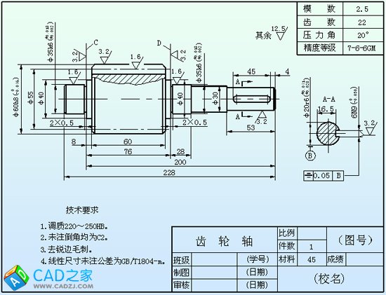 平面圖:這是學生畫的機械零件的圖,叫零件圖,有圖形、尺寸、技術要求等,還有右下方的表格,稱為標題欄。這樣的圖用CAD繪制十分方便,熟練的繪圖員半個小時就完成了,要是手繪,得用幾個小時而且手繪不是很準確。