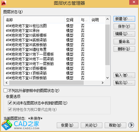 這個是我做得一個工程,地下2層,把3層平面的柱、模板、梁配筋、板配筋等全部疊在1個平面里畫了,當然這個比較夸張,我之后如果地下有2層的情況一般也會在1個文件中分2個平面來畫,或者用外部參照做2個文件來畫。這里提醒一下,圖層狀態(tài)命名時,把工程名稱都加進去,否則來回考圖的時候容易出現(xiàn)錯亂。
