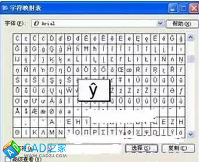標高的±號,在AutoCAD的文本編輯器中,輸入%%p就可以完成。其他很多特殊符號輸入,也可以通過這種方式實現具體操作方法是:單擊文本編輯器右上角的“選項”向下的按鈕,在打開的下拉菜單中選擇“符號”子菜單中的相應命令,如圖8所示,或按相應命令后面的命令提示在命令行中輸入相應命令。對于其他更復雜的符號,還可以選擇其中的“其他”命令打開“字符映射表”對話框,如圖9所示,選擇需要的字符,然后單擊“復制”按鈕,回到AutoCAD的文本編輯器,執行CTRL+V鍵盤命令粘貼進AutoCAD的文本編輯器即可。
