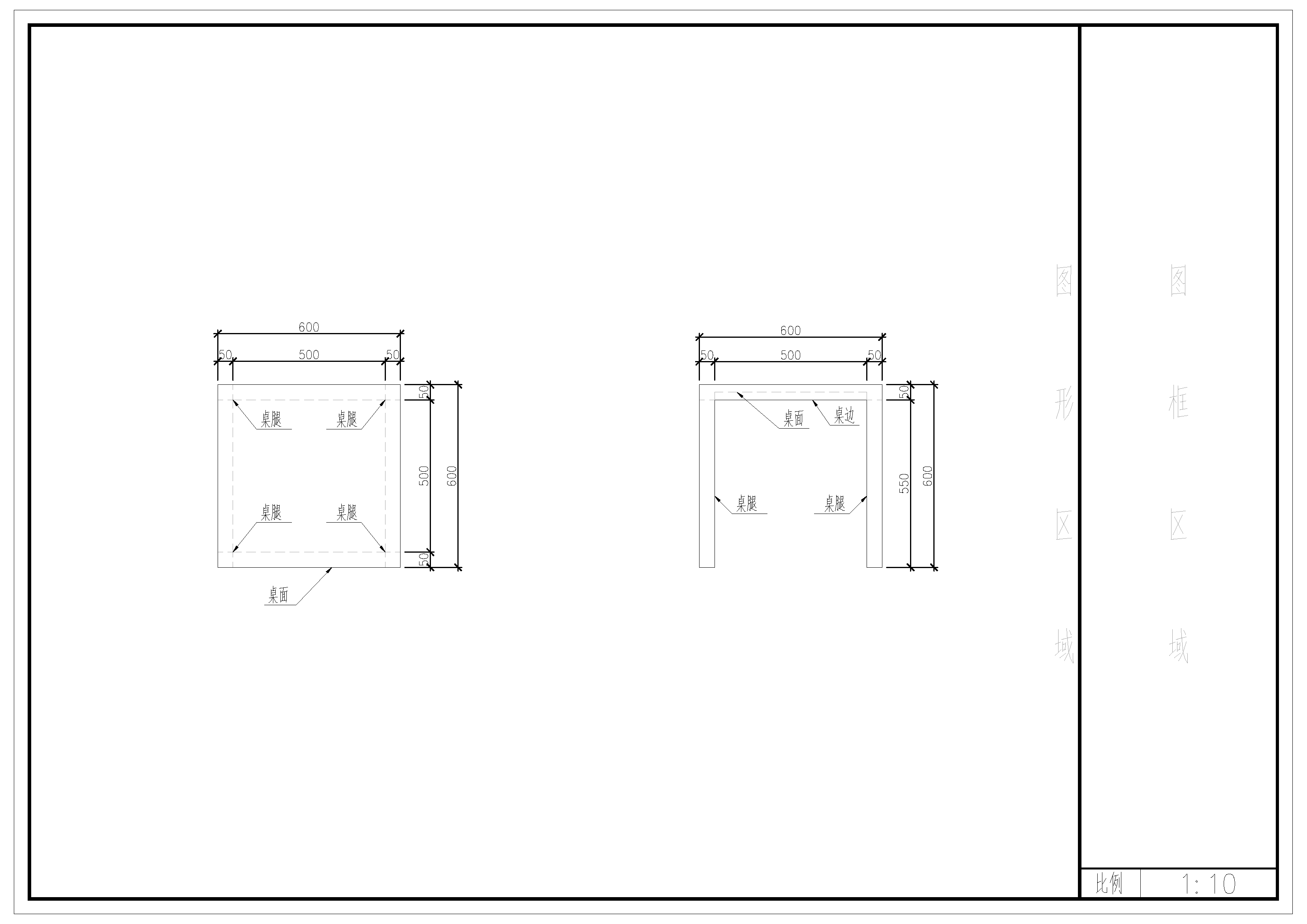 圖1與圖2為同一張桌子在不同比例的A3圖紙下的樣子,可以看到,在比例由1:5變成1:10后,桌子在圖中的大小也變成了原來(lái)的1/2。需要注意的是,圖中實(shí)體類(lèi)的圖元大小發(fā)生了改變,而如標(biāo)注、說(shuō)明文字等注釋類(lèi)的圖元,其大小卻是不變的。