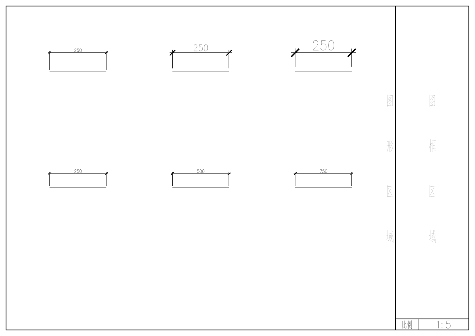 首先看圖中的六根線段,其長度全部為250mm,唯一不同的是標(biāo)注的比例的更改;