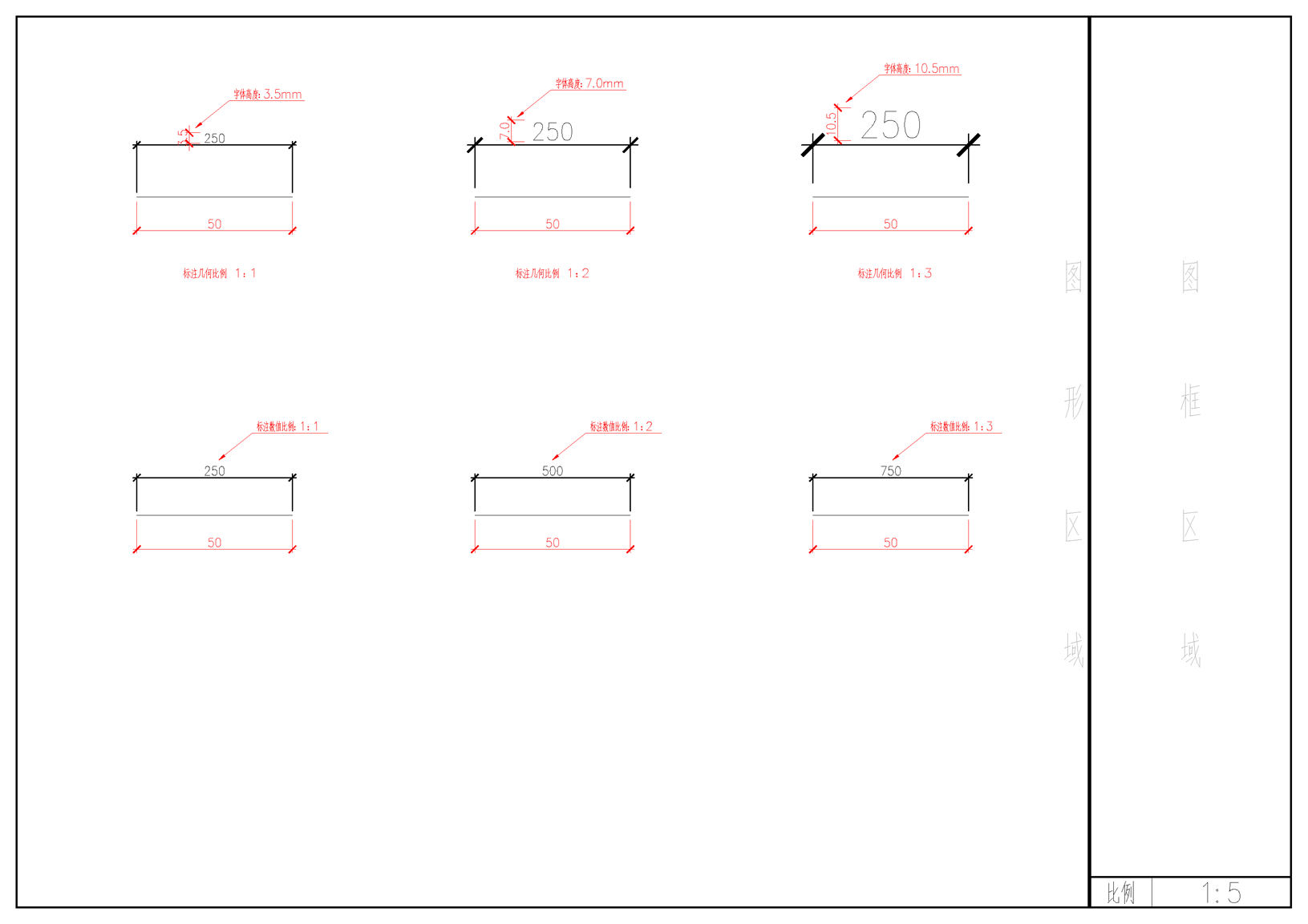 第一行的三個標(biāo)注,從左到右,"標(biāo)注幾何比例"分別為1、2和3,數(shù)值都是250,但是字體和字體兩端的箭頭卻一個比一個大;