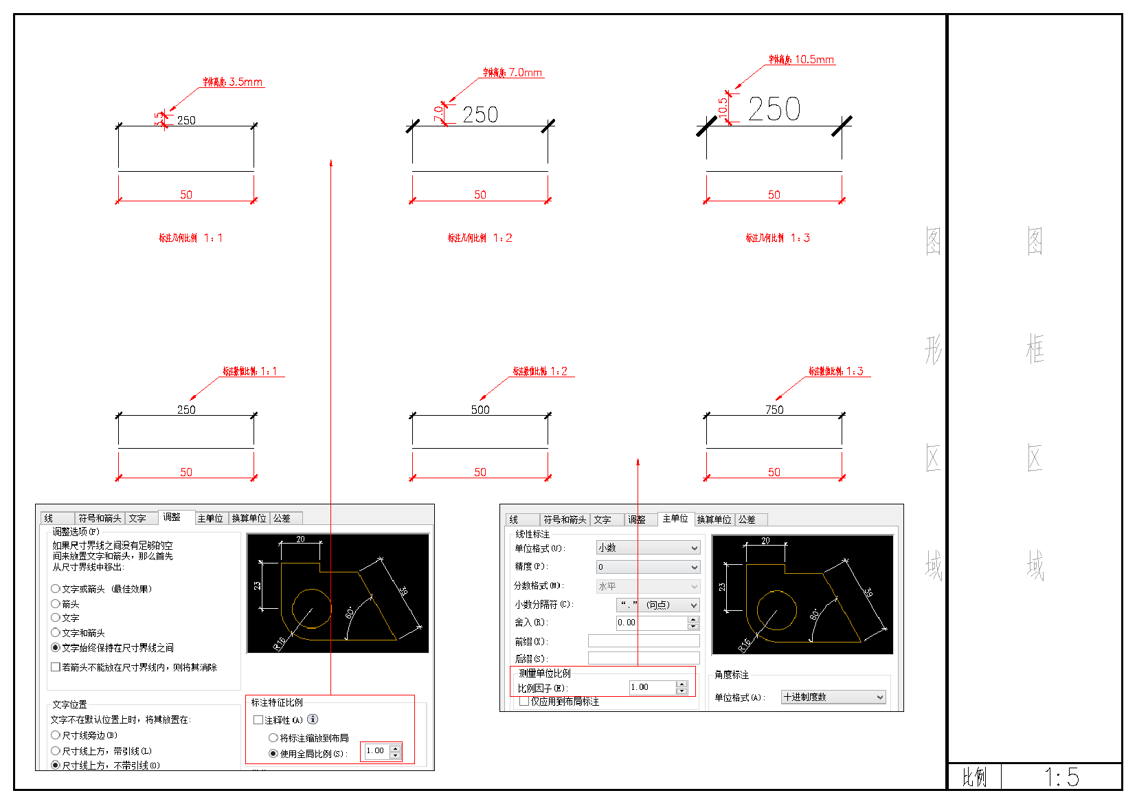 右下角圖為“標(biāo)注數(shù)值比例”,CAD會根據(jù)所標(biāo)注圖元的長度自動乘以該比例,然后輸出結(jié)果數(shù)值,圖中第二行的三個數(shù)值可以清楚地表現(xiàn)該比例的效果。該比例的使用場景參見第二部分的方案A,就是在1:100的圖框里放一個1:20的詳圖,由于繪圖比例變成了1:5,所以該詳圖所使用的標(biāo)注比例其“標(biāo)注數(shù)值比例”則變?yōu)榱?,這樣,其所表達(dá)的數(shù)值才是我們想要表達(dá)的確切數(shù)值。
