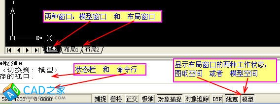 布局窗口,又分為兩種工作狀態(空間):圖紙空間 和 模型空間。在圖紙空間可以設置布局的(幾個)視口,每個視口的打印比例等。