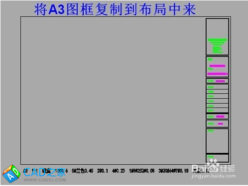 ②將已經繪制好的標準圖框拖到布局里面(此處用A3圖框為例,圖幅尺寸為420mm×297mm)。