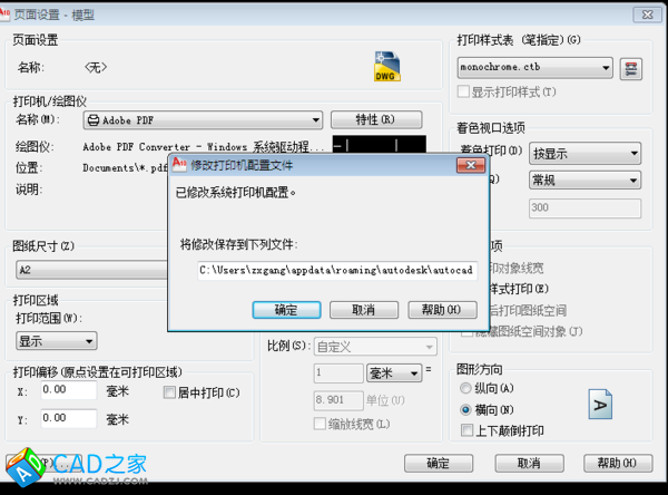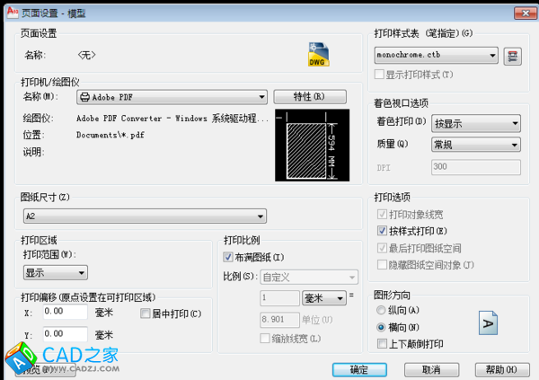 2.再點擊左上角“打印機/繪圖儀”欄下的“名稱”欄的adobe PDF右側的“特性”按鈕,在彈出的對話框中,見下圖,點擊下方的“自定義特性”按鈕。