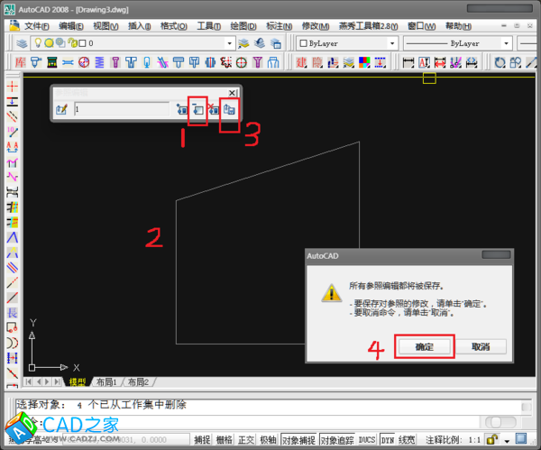 第二步:在彈出的工具條中選擇圖中所示的“從工具集刪除”命令,然后框選整個塊中的元素回車,最后點擊“保存參照編輯”命令,在彈出的對話框中點確定保存就可以了。