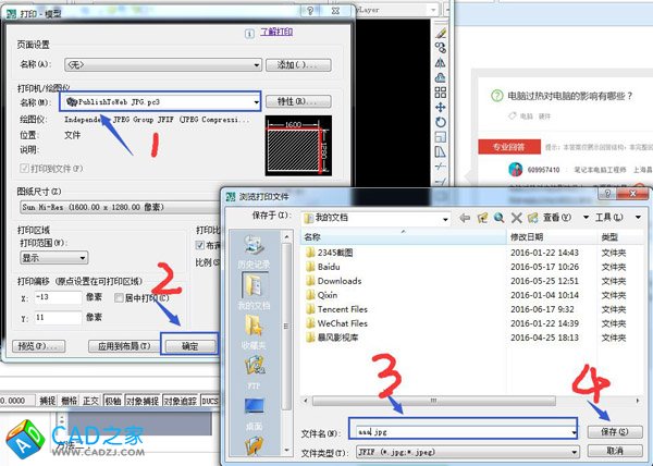 打開cad的圖形,點文件菜單,打印,設置打印機為PublishToWeb Jpg.pc3,確定,輸入名字并類型為.jpg,保存圖片。(如下圖)