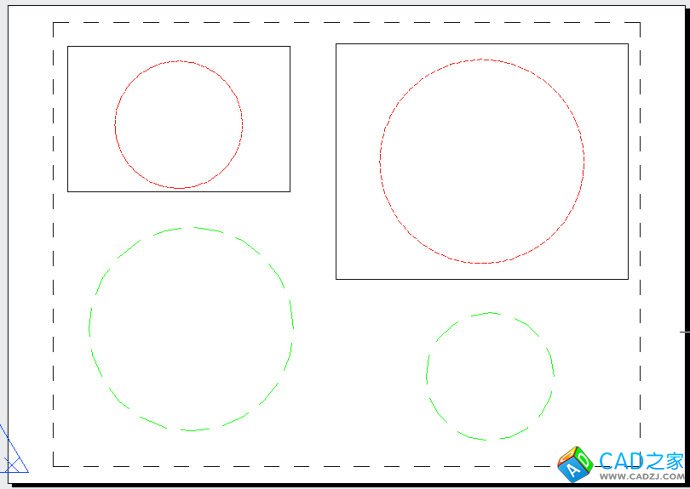 上圖中兩個紅色的圓是同一個圓在兩個比例不同視口中的效果,綠色的是畫在圖紙空間的圓,通過與綠色圓的對比,我們可以看到不同比例視口中的線型單元也是一樣的。