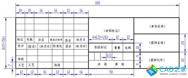 cad標(biāo)題欄我們一般按照國(guó)家標(biāo)準(zhǔn)來(lái)設(shè)置的,也有一些企業(yè)會(huì)有自己企業(yè)內(nèi)部的專用標(biāo)題欄。如圖所示就是國(guó)家標(biāo)準(zhǔn)的標(biāo)題欄: