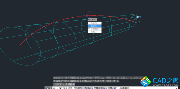 3. 三維放樣,截面選擇兩個(gè)繪制的圓,路徑選擇繪制彎管中心線圓弧。