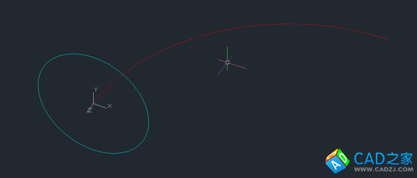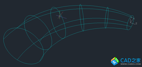 1. 在平面中畫出彎管的中心線——一段圓弧作為放樣的路徑,把UCS放到弧的一端并旋轉(zhuǎn)UCS到與繪制的中心線垂直,在新UCS平面中繪制圓錐管大頭的外圓(先繪制小頭也一樣)