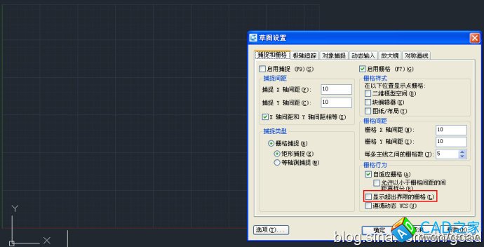 柵格是點或線的矩陣,遍布指定為柵格界限的整個區域。使用柵格類似于在圖形下放置一張坐標紙,利用柵格可以對齊對象并直觀顯示對象之間的距離。柵格是不會打印的。柵格可以只在圖紙界限(limits)內顯示,也可以不受圖紙界限的限制,如下圖所示: