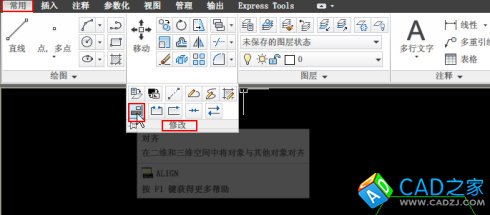 其實讓兩個圖形對齊的方法不止一種,比如我們可以利用旋轉的參照參數,也可以用對齊命令。對齊命令更方便,只是這個命令在菜單里隱藏的比較深,在修改菜單的三維操作下,如下圖所示。