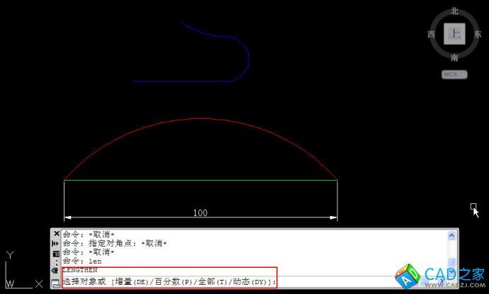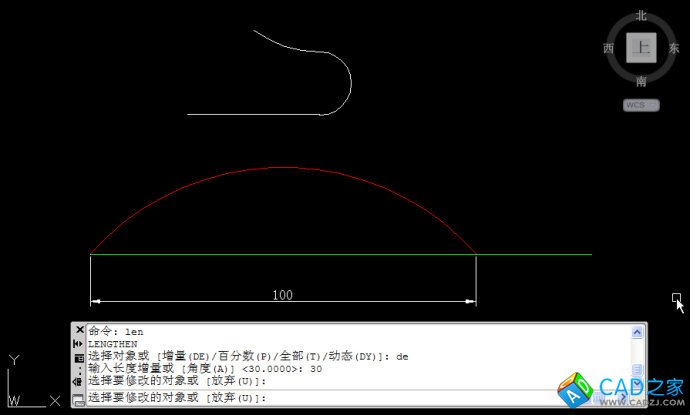 如果想讓一條圓弧變成指定長度,可以用拉長的全部(T)也就是總長參數。下面簡單看一下操作。
