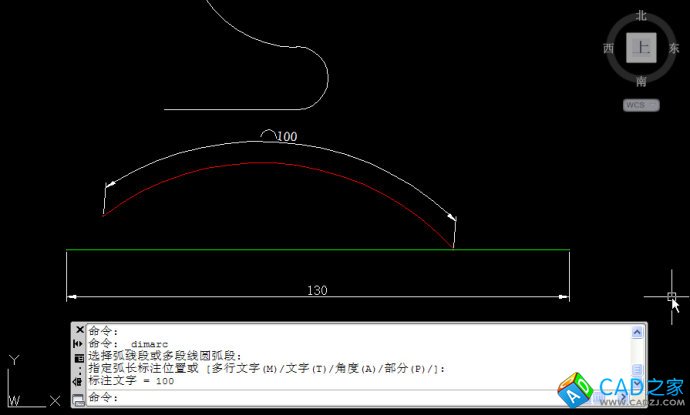 2、修改后可用弧長標注驗證一下,被拉長的圓弧是否滿足條件,如下圖所示。