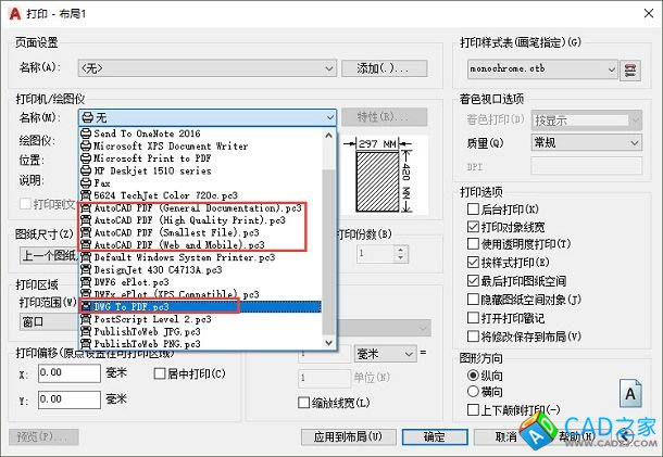 在CAD高版本中除了DWG TO PDF驅(qū)動(dòng)外,還有多種針對不同需求的PDF打印驅(qū)動(dòng),這些PDF驅(qū)動(dòng)只是預(yù)設(shè)的分辨率和尺寸不同,如果感興趣你可以看看這些驅(qū)動(dòng)的區(qū)別。