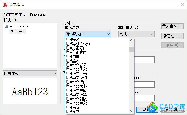 我們可以直接在文字樣式對話框中看一下,啟動CAD后新建一個空文件,輸入ST后回車,打開文字樣式對話框,我們可以看一下字體列表,可以看到有一系列帶@的字體,下面還有同名不帶@的字體,如下圖所示。