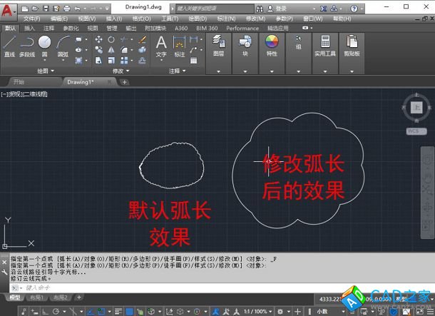 執行云線命令后,輸入A,回車,就可以設置最小弧長,默認的弧長是0.5,我們可以手動輸入最小弧長,也可以在圖中通過定義兩點來定義弧長。最小弧長設置合適的話,云線的圓弧段會減少很多,如圖所示。