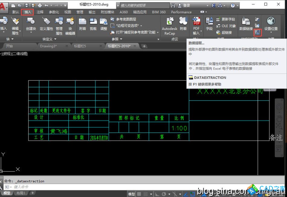 準備一張圖紙,圖紙中有多段線或屬性塊都可以。數據提取功能可以用下面幾種方式調用,菜單:工具>數據;功能區面板的插入選項卡中單擊數據提取按鈕,如圖所示;命令行直接輸入EATTEXT。