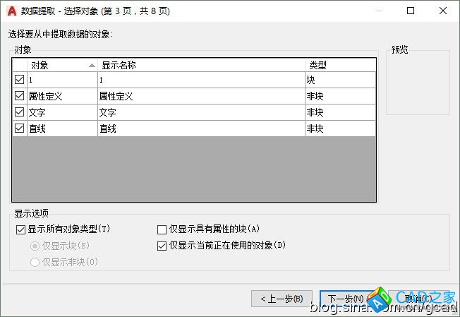 第三頁中會列出選擇圖形中包含的圖形類型,例如我選擇的圖塊中包含圖塊本身、屬性文字、文字、直線。當我們選擇的對象類型比較多時,還可以在下面的顯示選項中選擇只顯示塊、非塊、屬性快等。