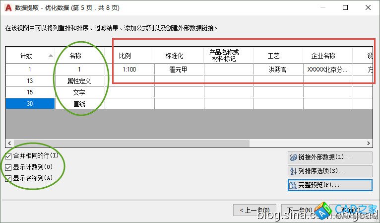 在這一頁中將我們提取的數據都列出來。前兩列是圖形的計數和名稱,就是圖形的數量和類型,后面各列是各種屬性和屬性值。我們可以看到圖塊中有13個屬性、15個文字、30根直線,如果這些數據不需要,我們在單擊“上一頁”按鈕返回第3頁,將屬性、文字、直線去掉,然后再返回到第5頁。在底部,還可以設置是否要名稱和數量這兩列。此外還可以鏈接外部數據、排序和預覽,如圖所示。