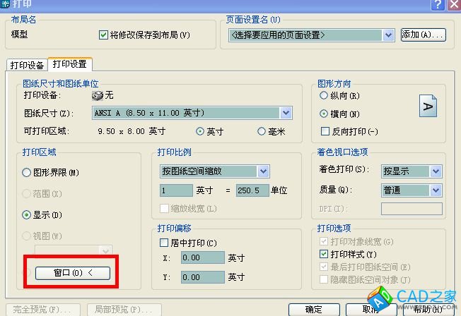 打印設置-選擇圖紙大小,打印區域-選擇窗口-選定打印的范圍,