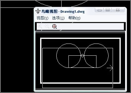 鳥瞰視圖窗口如圖所示,顯示整個圖形,并用一個粗線矩形標記當前視圖,該粗線矩形即為視圖框,可以移動視圖的位置或者改變視圖框的大小來動態更改圖形中的視圖。