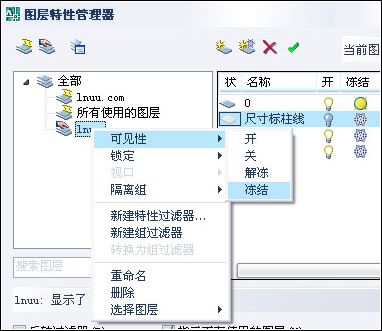 1、打開“圖層特性管理器”對話框,在左側的樹狀圖中選擇“lnuu”組過濾器,然后單擊鼠標右鍵,在彈出的快捷菜單中選擇“可見性”——“凍結”選項,則“lnuu”組過濾器中的圖層將全部被凍結。