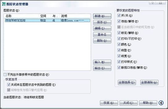 1、打開“圖層狀態管理器”對話框,單擊“要恢復的圖形特性”選項區中的“凍結/解凍”復選框,取消“凍結/解凍”的選擇,然后單擊“恢復”按鈕,則“lnuu”組過濾器中的圖層恢復原先的“解凍”狀態。