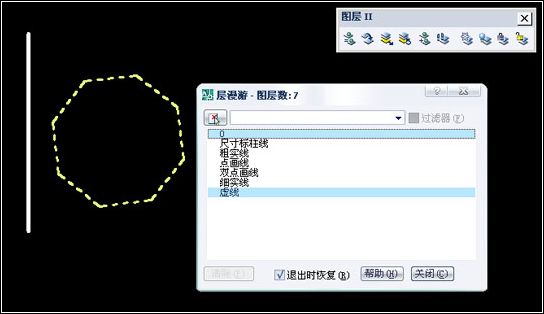“凍結(jié)”和“關(guān)閉”不是刪除圖層,可能只是暫時(shí)的“隱藏”(我的理解),因?yàn)樵凇皩勇巍睂?duì)話框中還會(huì)顯示“細(xì)實(shí)線”層和“虛線”層,選擇“細(xì)實(shí)線”層和“虛線”層,在繪圖區(qū)中“矩形”和“八邊形”還會(huì)顯示。