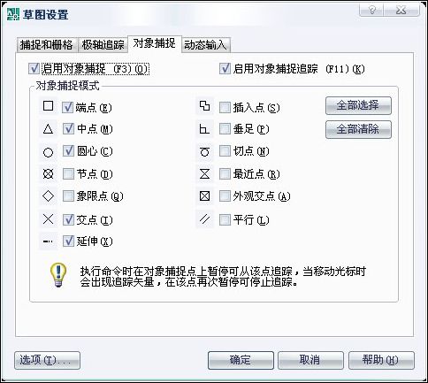 1、每個選項的前面都有捕捉到該特征點時顯示的特征符號,設置一些對象捕捉模式后,當光標移動到一個圖形時,系統會自動捕捉該圖形上符合所設置的捕捉模式條件的特征點,并顯示捕捉標記及其提示。