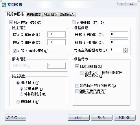 菜單欄【工具】——“草圖設置”,打開“草圖設置”對話框,可以對“捕捉”、“柵格”、“極軸追蹤”、“對象捕捉”和“動態輸入”進行設置,從而可以更容易、更準確地創建和修改圖形對象。