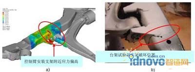 載荷工況1~22基于慣性釋放法采用線性分析,工況23~26采用非線性強(qiáng)度分析。CAE分析發(fā)現(xiàn),該前副車架控制臂安裝支架附近應(yīng)力偏高,與臺(tái)架試驗(yàn)破壞部位吻合,如圖4所示。說(shuō)明本文建立的CAE模型精度較高,載荷工況選取適當(dāng),可以較為準(zhǔn)確的預(yù)測(cè)副車架的強(qiáng)度薄弱部位,快速找出影響副車架強(qiáng)度的載荷工況,為改進(jìn)設(shè)計(jì)提供理論依據(jù)。