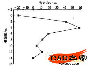 由圖2可知,隨著距角點距離的增大,樁體水平位移不斷增大,即跨中位移呈現最大值,并且隨著開挖深度的增加,樁體中下部的位移發展很快。開挖終了時,最大的側向位移發生在距樁頂6 m附近;由圖3可知,跨中位移最大處灌注樁的最犬彎矩值出現在距樁頂4 m處,之后隨深度的增加彎矩值逐漸減小。