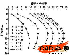 由圖5可以看出。由于軟土的流變特性,樁的最大位移并非發生在樁頂,而是發牛在距樁頂3 m以下部分。與實際情況相符。所以三維有限元模擬分析成果和基坑真實情況在整體上相吻合。