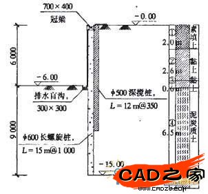 采用ANSYS有限元分析方法,針對某基坑剛性支護結構與相關巖土參數進行了支護結構穩定性及變形計算。模擬范圍和計算參數如下:基坑圍護采取鉆孔灌注樁支護結構(見圖1)?;娱_挖坑深6.00 m,基坑尺寸為40 m(短邊)×80 m(長邊),基坑圍護結構采用Ф6000@1 000鉆孔灌注樁,樁長為15.00 m,樁頂設置800 mm X 500 mm冠梁。混凝土強度等級為C30。計算時考慮施工超載15 kPa。