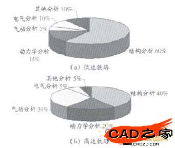 圖1 CAE分析技術在低速和高速鐵路設計分析中各學科的比例