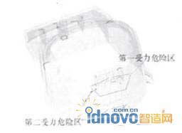 但實(shí)際注射成型中,因?yàn)樵搩蓚€(gè)危險(xiǎn)區(qū)域存在熔接線以及應(yīng)力集中,如圖4所示。研究表明:對(duì)于脆性聚合物的熔接線融合強(qiáng)度系數(shù)在最佳工藝條件下在0.6~0.7以下,典型材料如PS、SAN、PMMA;對(duì)于韌性聚合物的熔接線融合強(qiáng)度系數(shù)在最佳工藝條件下在0.7~0.8以上,典型材料如POM、PP、PC、ABS。