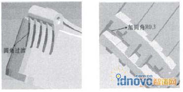 該零件因在試產(chǎn)階段,模具已經(jīng)完成,零件幾何上的調(diào)整空間不大,因此,一方面,優(yōu)化注塑工藝參數(shù)設(shè)置(調(diào)整注塑壓力、速度、熔體溫度及模具溫度等),增強(qiáng)熔接線的熔接強(qiáng)度;另一方面,更改零件設(shè)計(jì),增加圓弧過渡,消除原始設(shè)計(jì)中的應(yīng)力集中,如圖8所示,可明顯加強(qiáng)零件強(qiáng)度,同時(shí),模具的修模非常簡(jiǎn)單。
