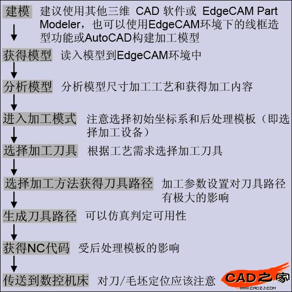 學習一個應用軟件時,首先需要了解該軟件的完整應用過程,這樣才能更好地學習和應用軟件。學習EdgeCAM也一樣,我們首先需要非常清楚地了解軟件的應用流程: