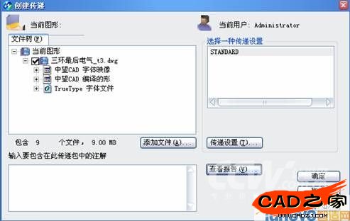 如果實施了上述三個技巧以后仍然達不到我們的要求,那么還有一個技巧,就是利用WINRAR文件的壓縮功能。在傳送DWG文件前,用WINRAR壓縮,效果比較好,幾乎只有原來的40%左右。或者采用中望CAD 2009中的“電子傳遞”功能,它能夠進行智能化的圖紙壓縮處理,壓縮包中不僅包含了DWG文件,而且還可以按照需要打包圖紙中的字體文件和字體映射表,更進一步方便了彼此之間的圖紙交流。如圖: